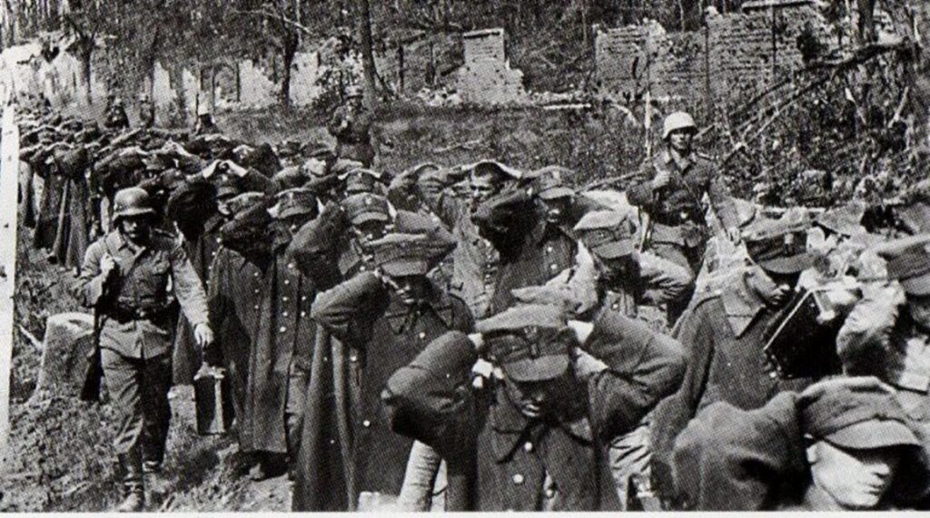 Йозеф Лопатнюк (Józef Łopatniuk)– командир протитанкових гармат крокує зі своєю валізкою до полону. Наразі цю валізку можна побачити в невеликій експозиції вартівні №1. Фото за (Wójtowicz-Podhorski, 2009)